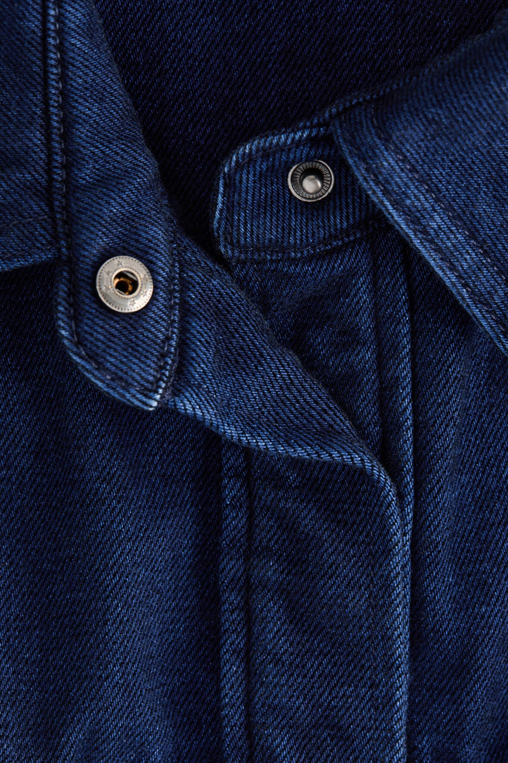Shirt in rigid cotton denim with a collar, concealed press-studs down the front and flap chest pockets. Relaxed fit with a yoke at the front and back, dropped shoulders and a rounded hem.