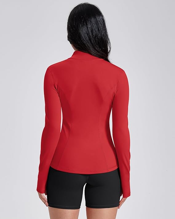 - Workout Tops for Women – The unique design of the sports jacket showcases a sleek, modern design featuring a streamlined back silhouette and elegantly curved hem; The windproof stand collar can effectively block gusts of wind to ensure you stay warm during outdoor activities; Long Sleeve Light jacket with thumb holes can stabilize the cuffs to prevent them from sliding down during exercise